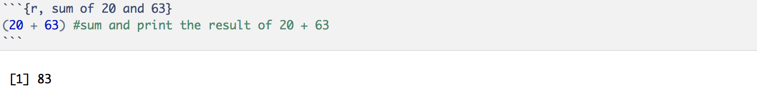 The chunk header, {r}, is typically used to add arguments that tell RStudio whether or not to include the chunk’s code and results in the R Markdown file. This chunk header can also be used to name the code chunk. While naming a code chunk is not required, providing unique names will make your code easier to follow by telling readers what each code chunk contains. For example: