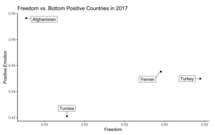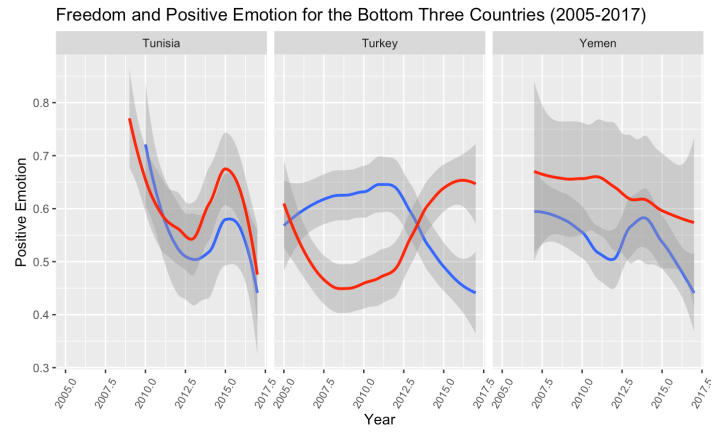 From these plots, we can see that each country has their own story to tell. Freedom and positive emotion have been on a downward trend for both Tunisia and Yemen, but act in opposite ways for Turkey. As freedom decreased, positive emotion increased and vice versa; implying that there are alternative underlying factors contributing to increased positive emotion in Turkey.