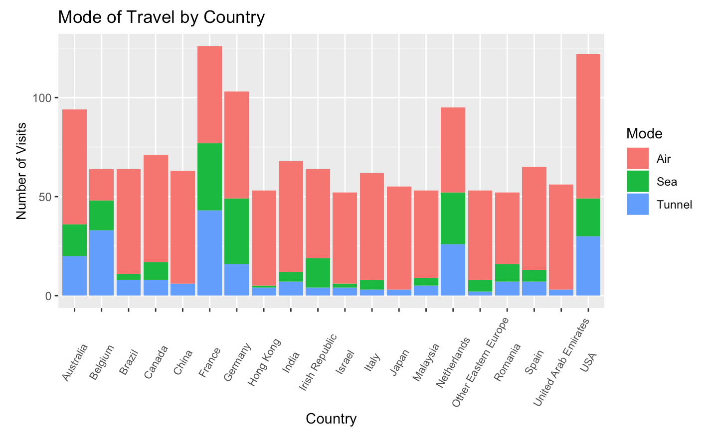 From the bar plot we can see that countries neighboring the UK, such as France, Germany and Belgium, have a larger percentage of visitors traveling by Sea and the Tunnel. Countries like the US and Australia, also have a decent amount of travelers commuting by Sea and the Tunnel, likely traveling directly from other European countries and not their home countries. Undoubtedly, most visitors do travel to London by air.